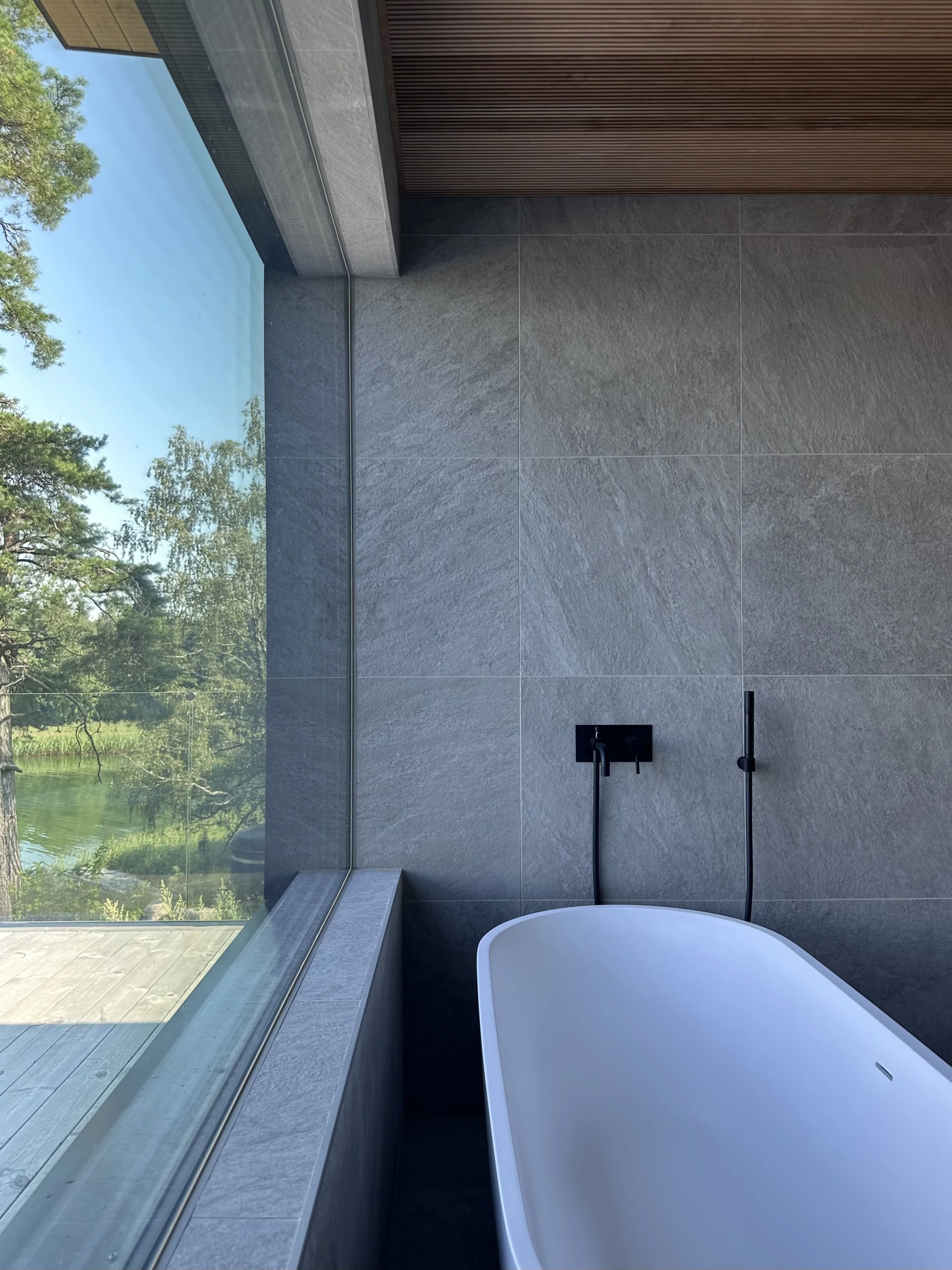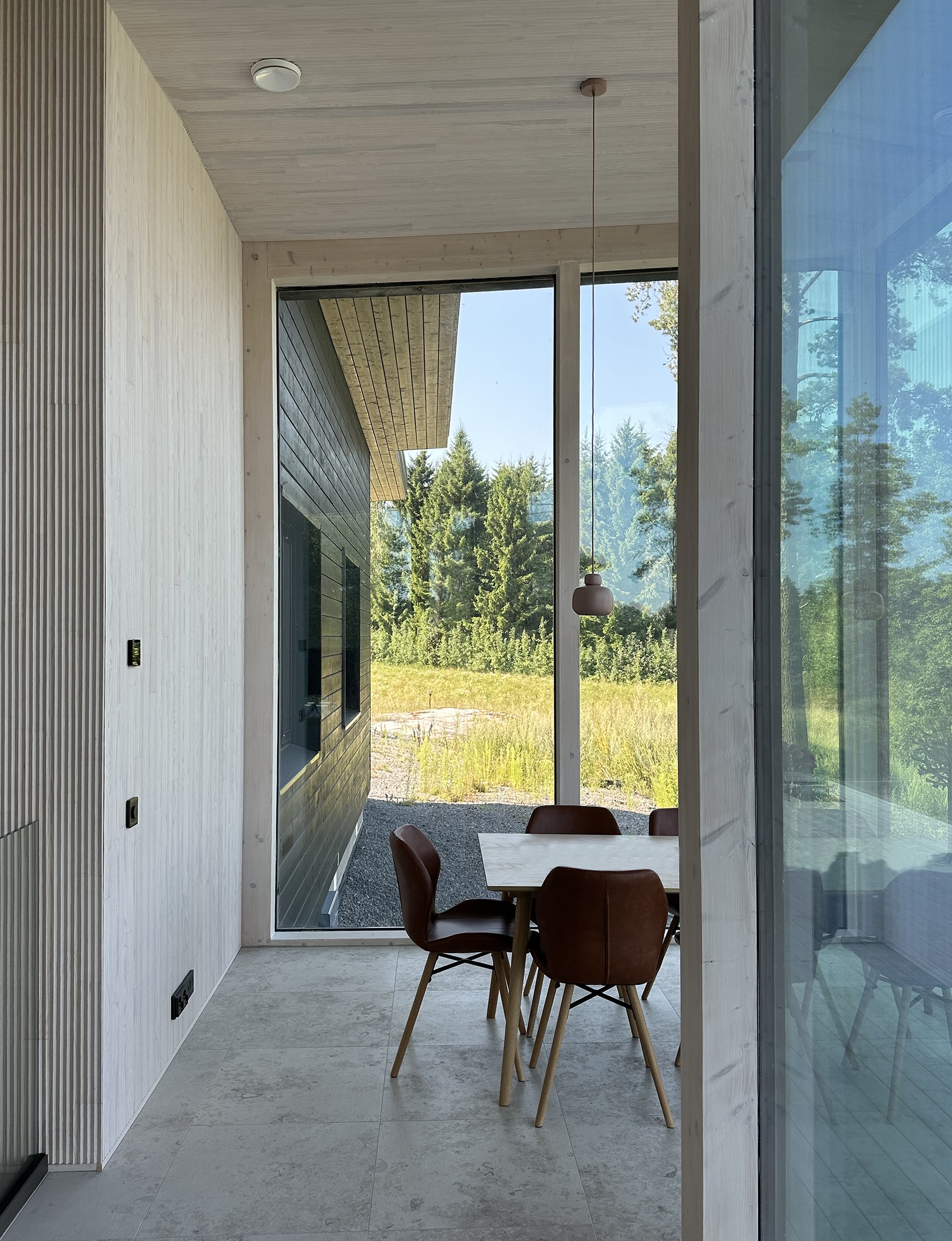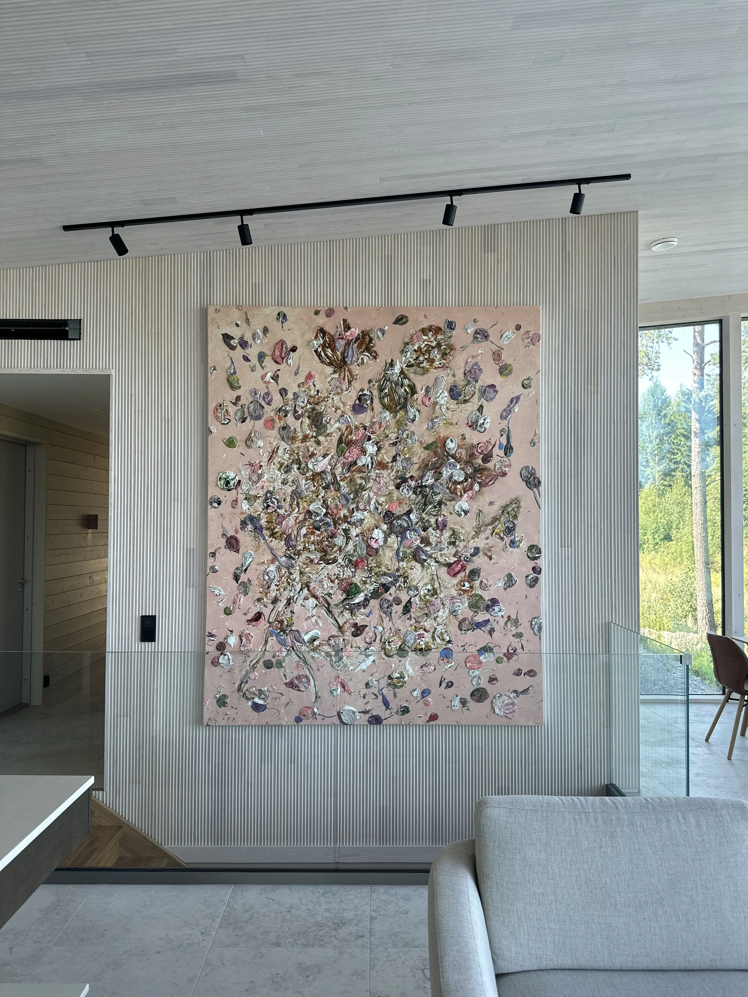 Inredningens stämning och färgskala hämtar sin inspiration från Heikki Marilas målning, som fått en självklar paradplats i hemmet. Väggarna kläddes i panel för att tillföra naturlig värme och skapa en mjuk, behaglig akustik.